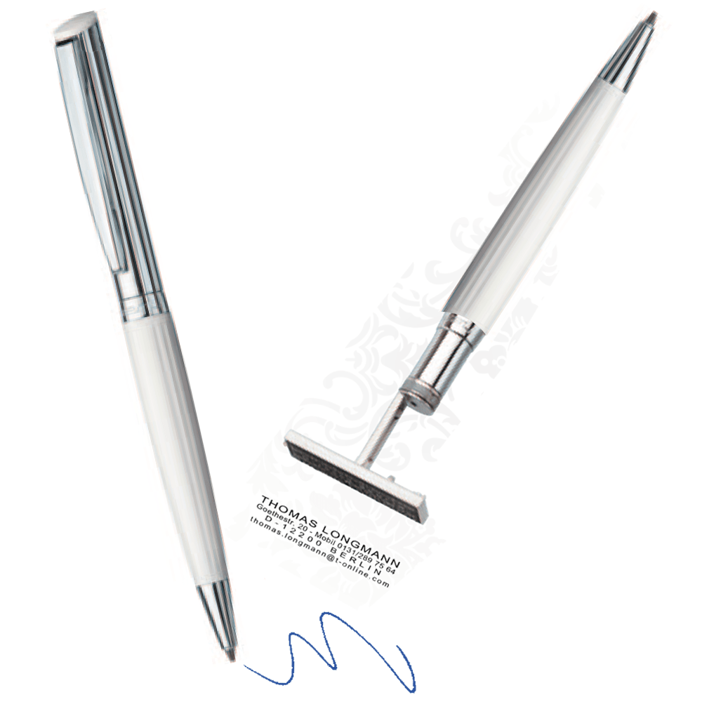 Stempelpen die vaak wordt gebruikt voor zakelijke doeleinden. Plaats in één handomdraai het gemaakte ontwerp op papier met de stempelzijde. De stempelpen beschikt daarnaast ook over een balpen. Eenvoudig om mee te nemen en komt professioneel over.