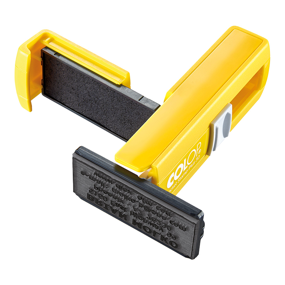 Pocket Stamp 30 PLUS met een geel montuur. Max. 5 regels.