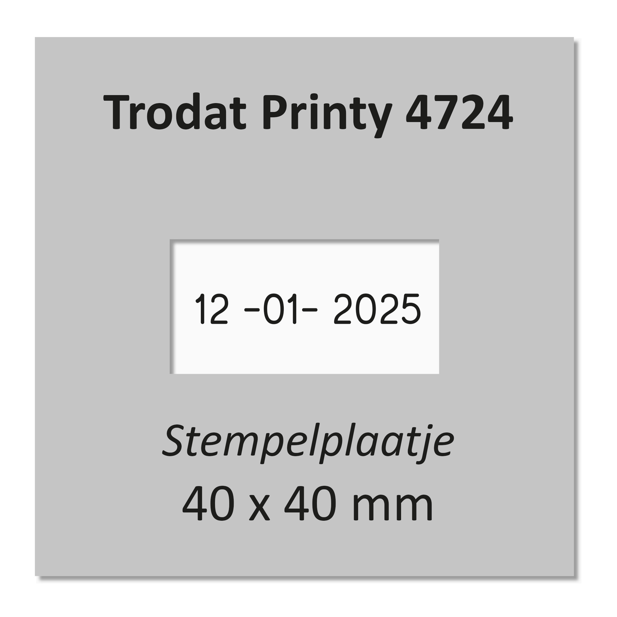 Stempelplaat t.b.v. Trodat Printy 4724 met maximale afmeting 40x40 mm inclusief de datum in het midden. Vergeet niet tevens het inktkussentje te vervangen aangezien deze ingesleten is op de tekst van het oude stempelplaatje. Zowel het inktkussentje als het stempelplaatje kunt u gemakkelijk zelf vervangen. Het stempelplaatje wordt geleverd inclusief een dubbelzijdige plaklaag.