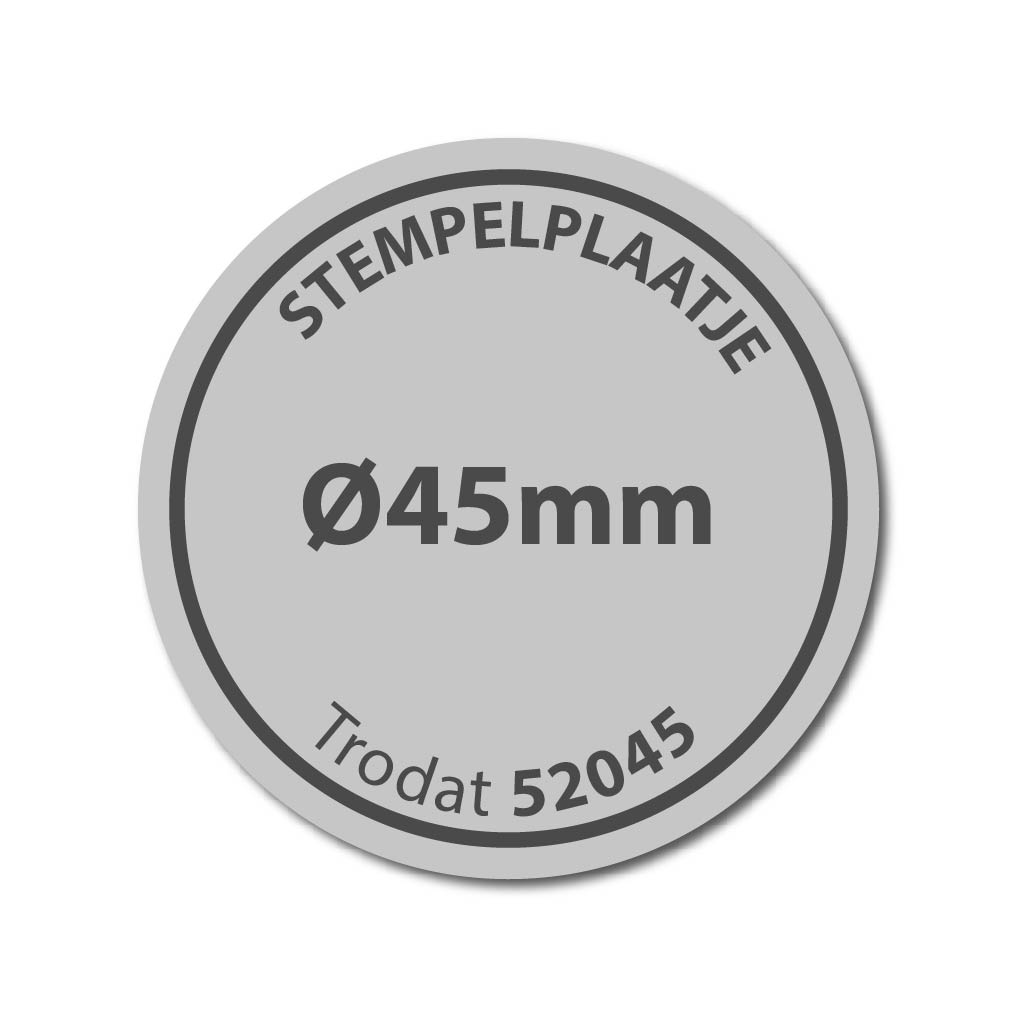 Stempelplaatje t.b.v. Trodat Professional 52045 met maximale afmeting doorsnede 45 mm. Recycle uw Trodat Printy door alleen het stempelplaatje en inktkussentje te vervangen. Gemakkelijk zelf te verwisselen. Het inktkussentje moet bijna altijd tegelijkertijd ook vervangen worden omdat deze is ingesleten op de oude tekst.