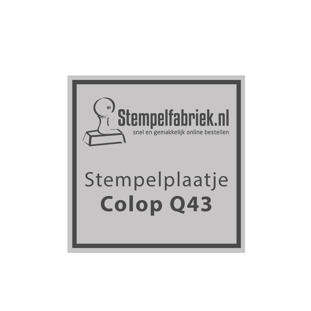 Stempelplaatje t.b.v. Colop Printer Q 43 met maximale afmeting 43x43 mm. Recycle uw Colop Printer door alleen het stempelplaatje en inktkussentje te vervangen. Gemakkelijk zelf te verwisselen. Het inktkussentje moet bijna altijd tegelijkertijd ook vervangen worden omdat deze is ingesleten op de oude tekst.