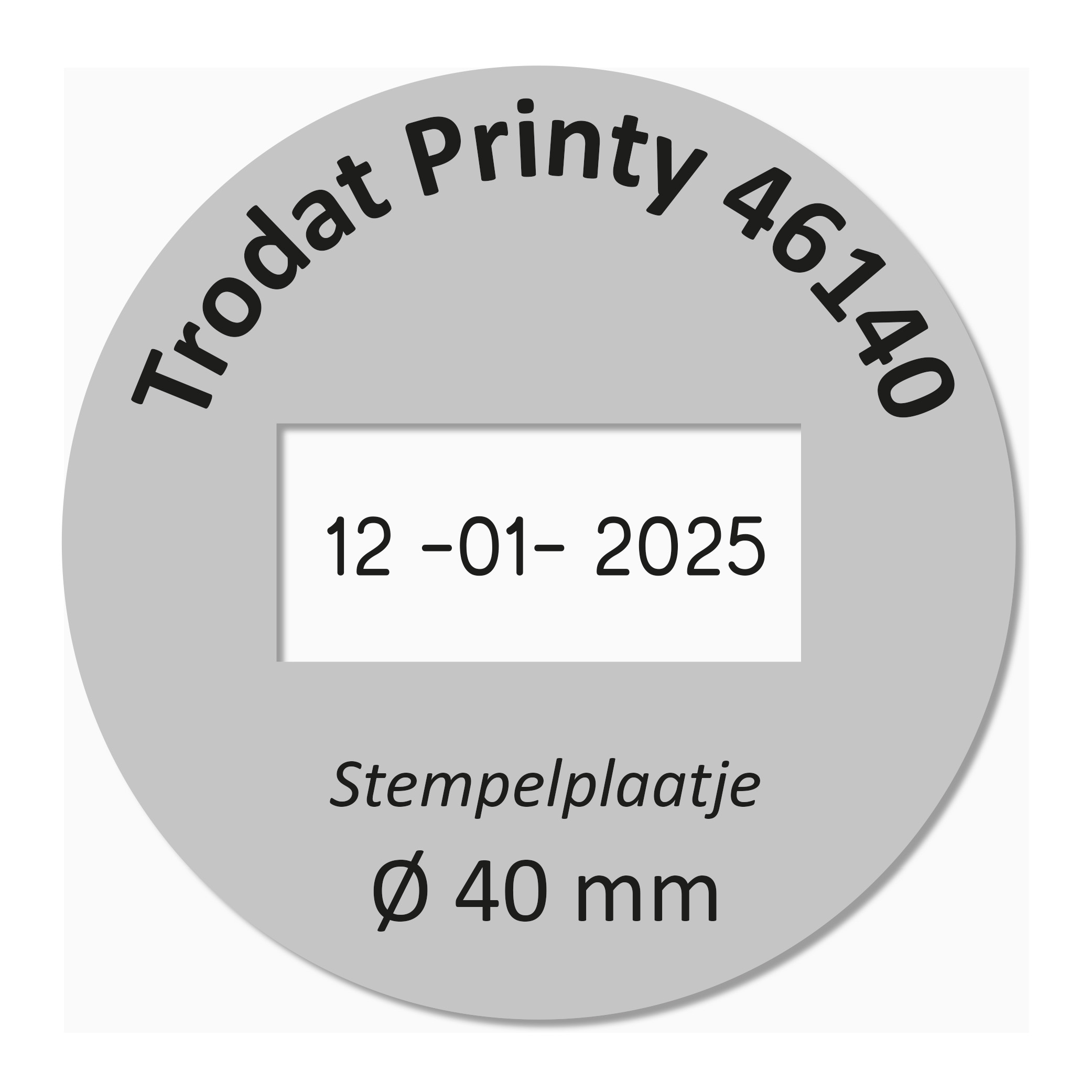 Stempelplaatje t.b.v. Trodat Printy 46140 datumstempel (voorheen 4740) met maximale afmeting Ø40mm. Recycle uw Trodat Printy door alleen het stempelplaatje en inktkussentje te vervangen. Gemakkelijk zelf te verwisselen. Het inktkussentje moet bijna altijd tegelijkertijd ook vervangen worden omdat deze is ingesleten op de oude tekst.