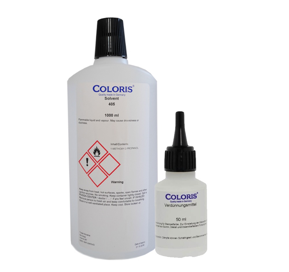 Is de Coloris R9 inkt wat ingedikt op uw stempelkussen? Gebruik dan dit oplosmiddel, Coloris 405, om het beïnkte kussen weer op te frissen. Voeg slechts een klein beetje van dit verdunningsmiddel toe en uw stempelkussen is als nieuw. Gebruik voor deze inkt en het oplosmiddel wel altijd een stempel die van rubber of metaal gemaakt is. Polymeerstempels kunnen beschadigen. Wij leveren enkel de rubberen en metalen stempel.